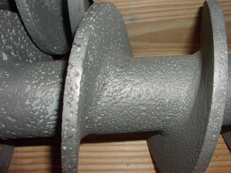 This customer had ongoing problems with product adhesion and buildup on the surfaces of transfer lines and equipment. The product buildup had slowed product transfer rates and lowered the system efficiency. Conveyor screws quickly developed product buildup, and began to place a large load on the drive motors. Product line was regularly shutdown to clean product buildup from screw faces. Surfaces exhibited heavy pitting due to corrosive environment.